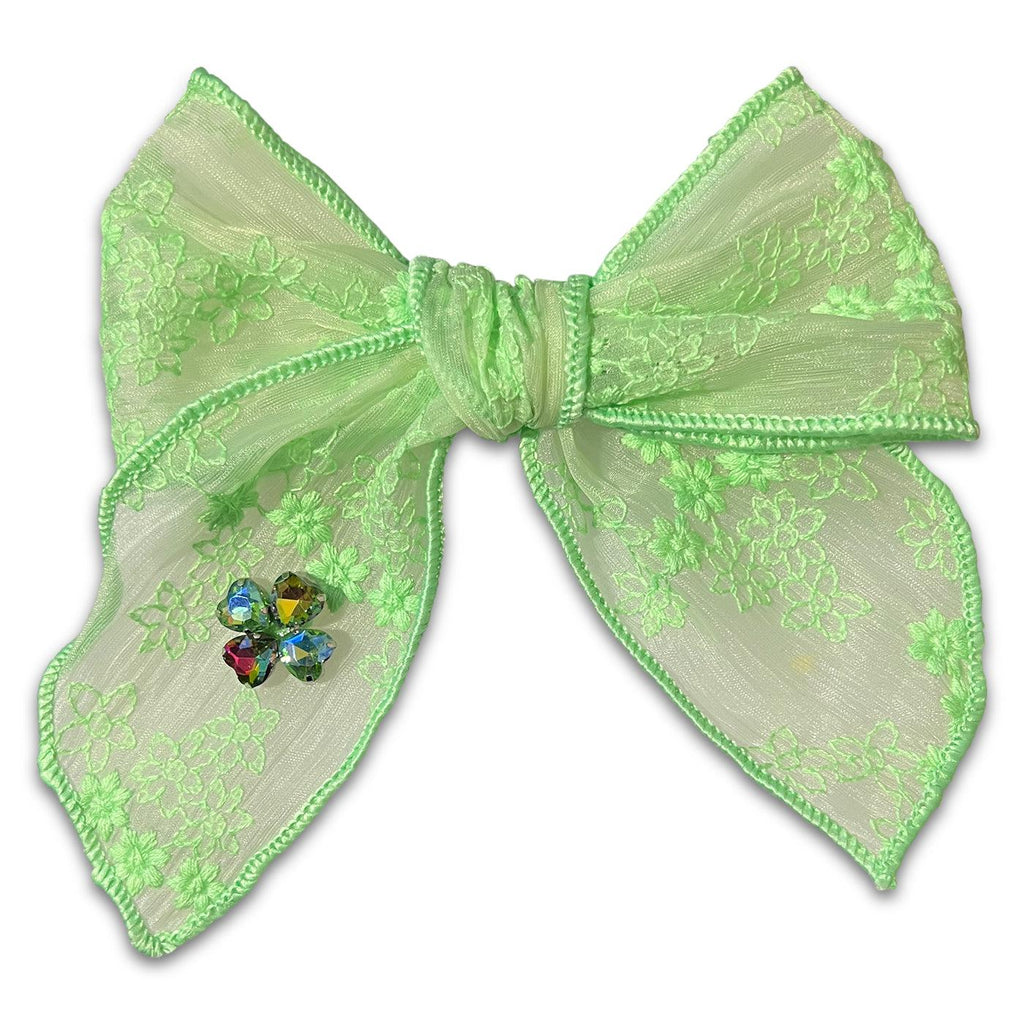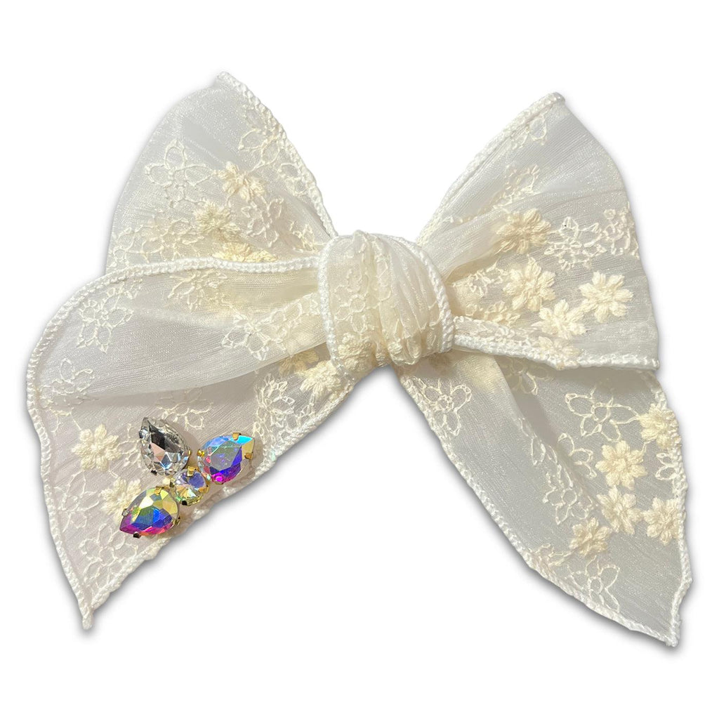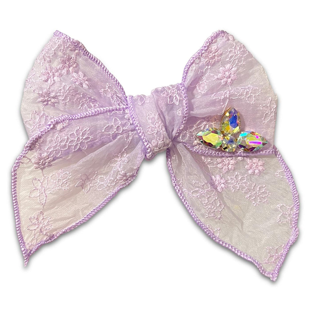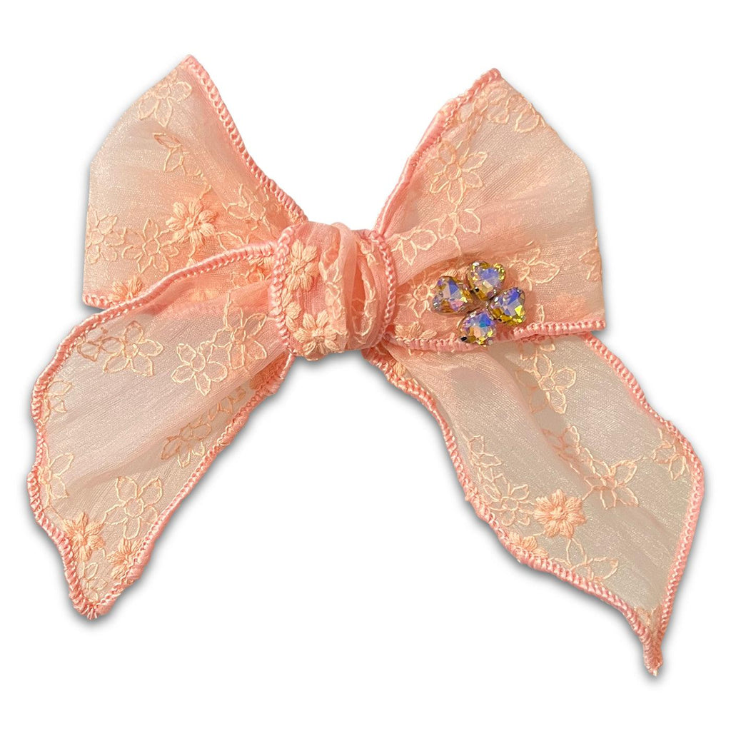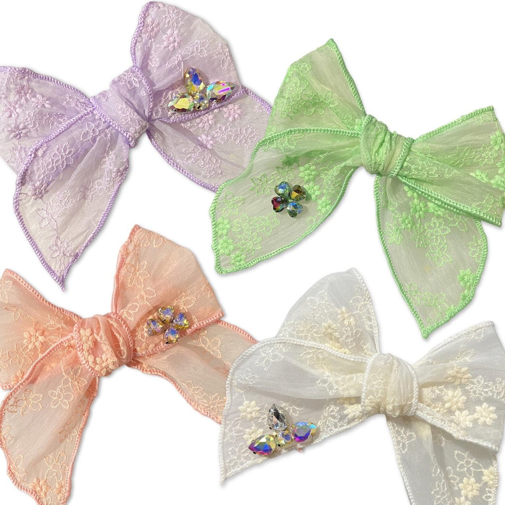 These no slip sheer floral hair bows are brand new and simply fabulous. Each bow is made from a sheer fabric, has a serged edge, and is embellished with beautiful glass gems attached in a particular pattern or shape. No two bows have the exact the same glass gem placement, making each one a unique and one of a kind hair bow.
