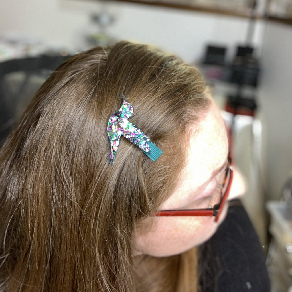 Each hummingbird measures 2" and will look beautiful in hers or your hair. The hummingbirds are now available on a pin as well as on our no slip alligator clip. Now you can wear your hummingbird on your clothing or your bag (and wherever else you can think of).