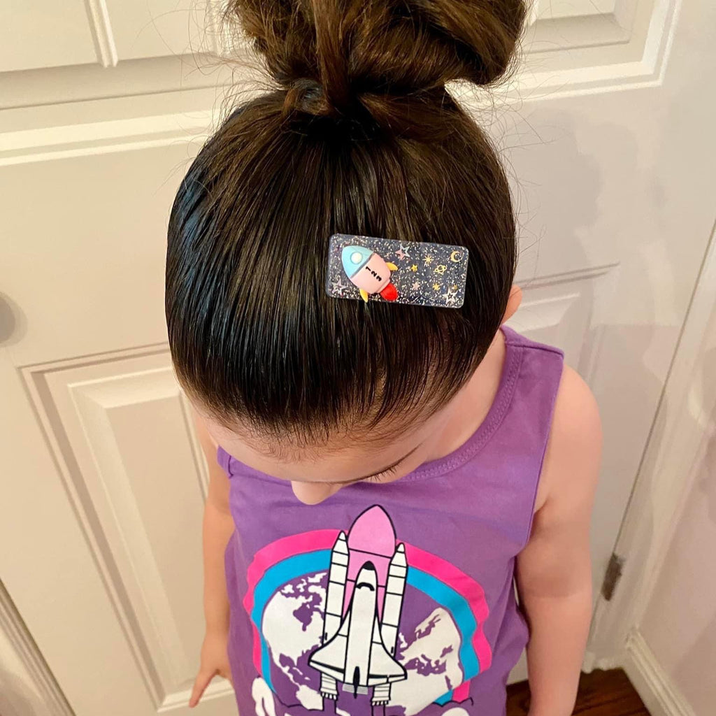 There are fun options to choose from like wide bar clips (2" long x 1" wide) and regular bar clips (2" long and 1/2" wide) with gold space embellishments or colorful space scenes. There is also a waving space person or rocket ship in a swirly galaxy. Each piece is attached to our lined alligator clip and coordinating no slip grip. These clips are great for all ages and ready for adventures.