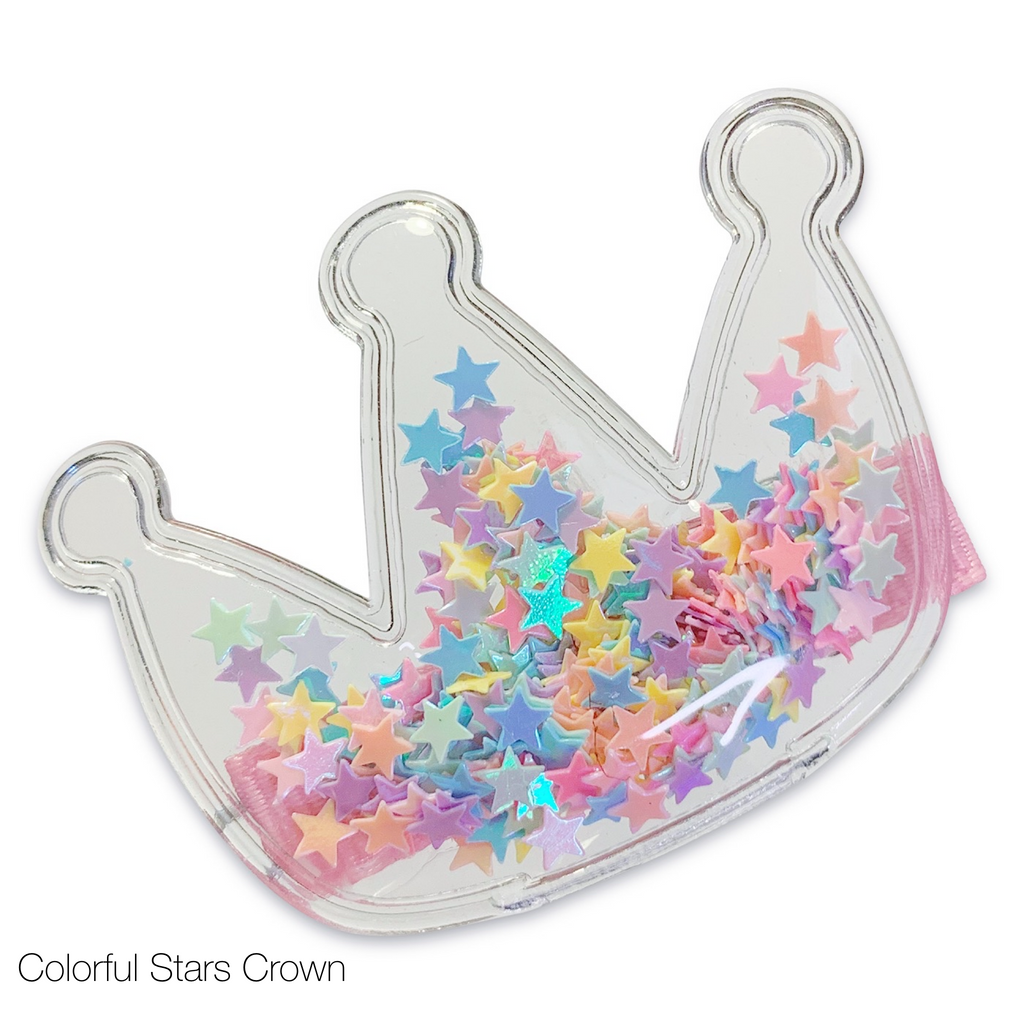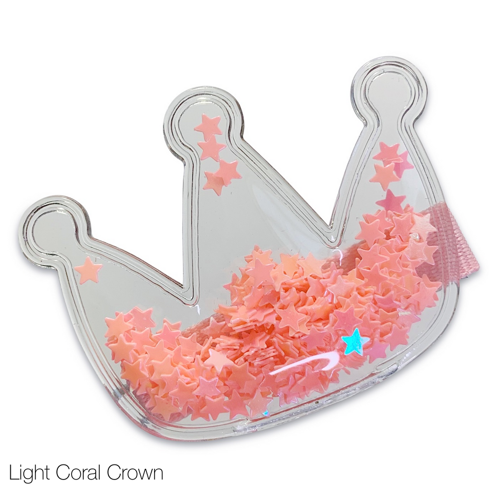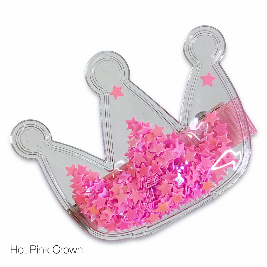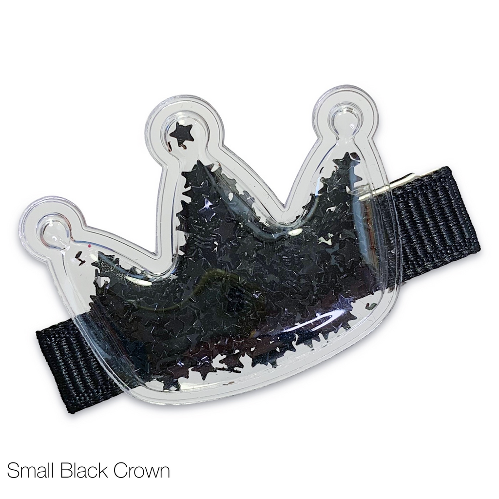 Each crown shaker (a puffed vinyl "pouch" filled up with an assortment of confetti fun that moves when you move) is attached to our no slip alligator clip and measures approximately 2 inches. There is a smaller crown in a few color options which measures 1.5 inches.