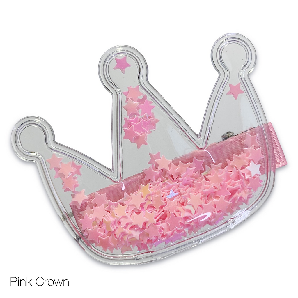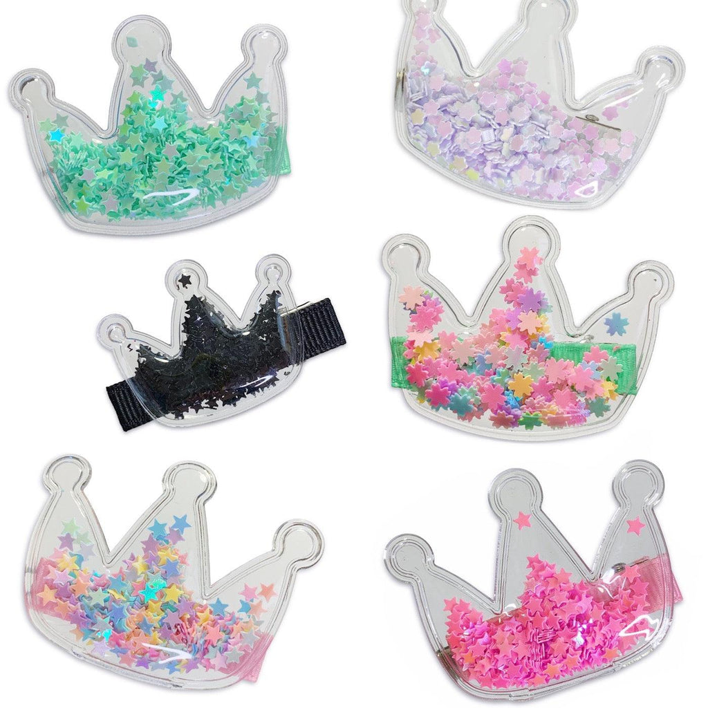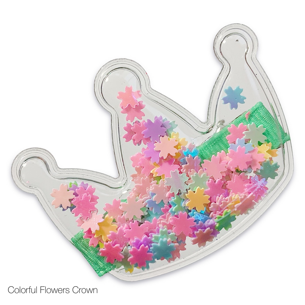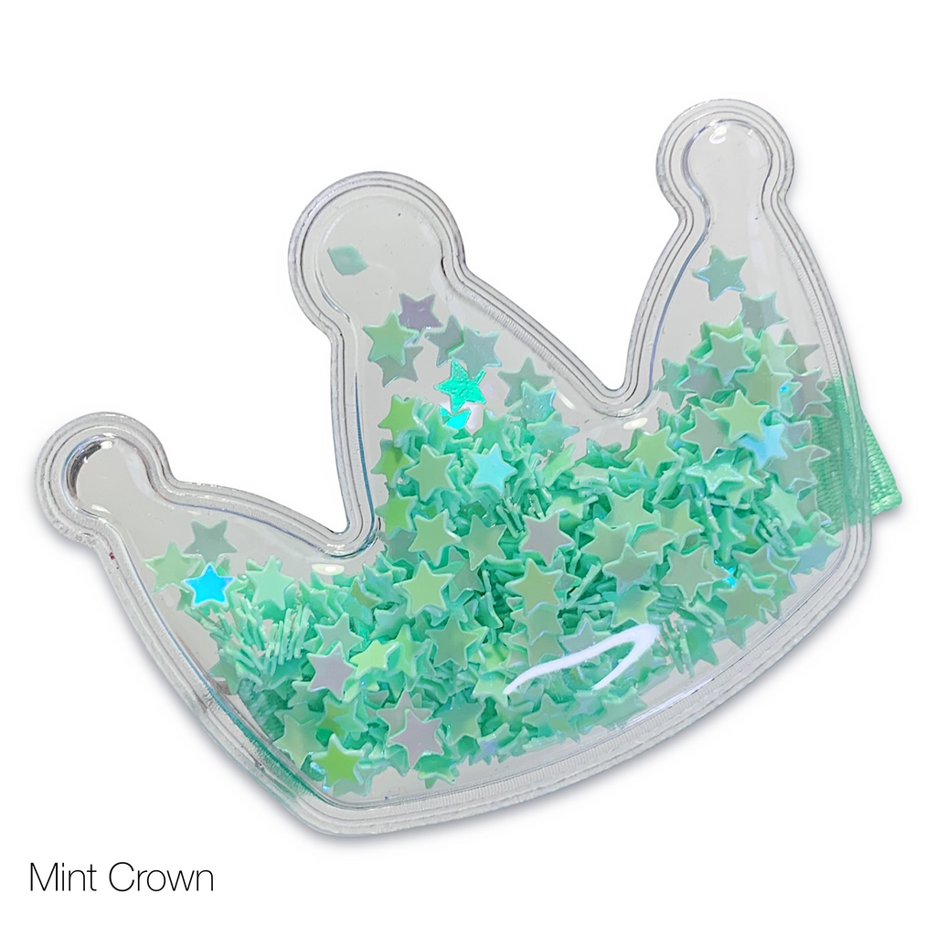 Each crown shaker (a puffed vinyl "pouch" filled up with an assortment of confetti fun that moves when you move) is attached to our no slip alligator clip and measures approximately 2 inches. There is a smaller crown in a few color options which measures 1.5 inches.