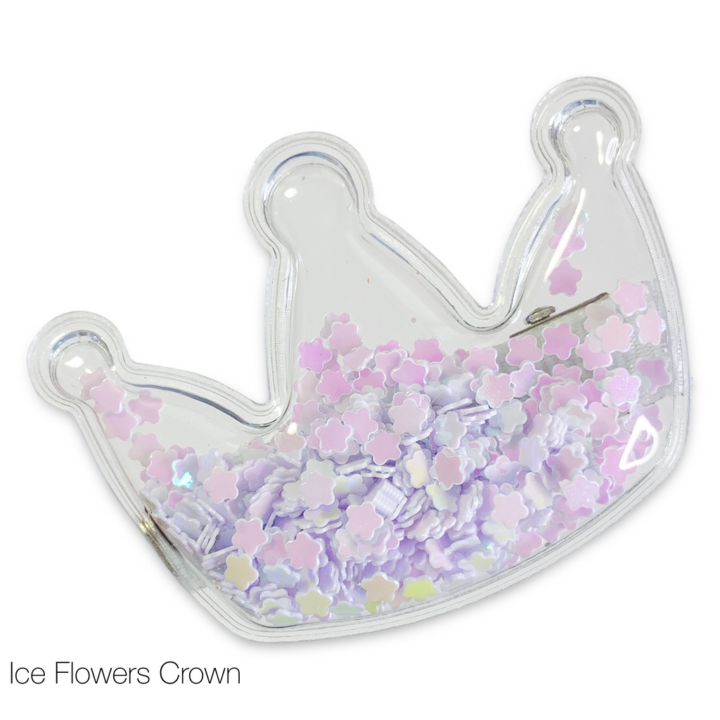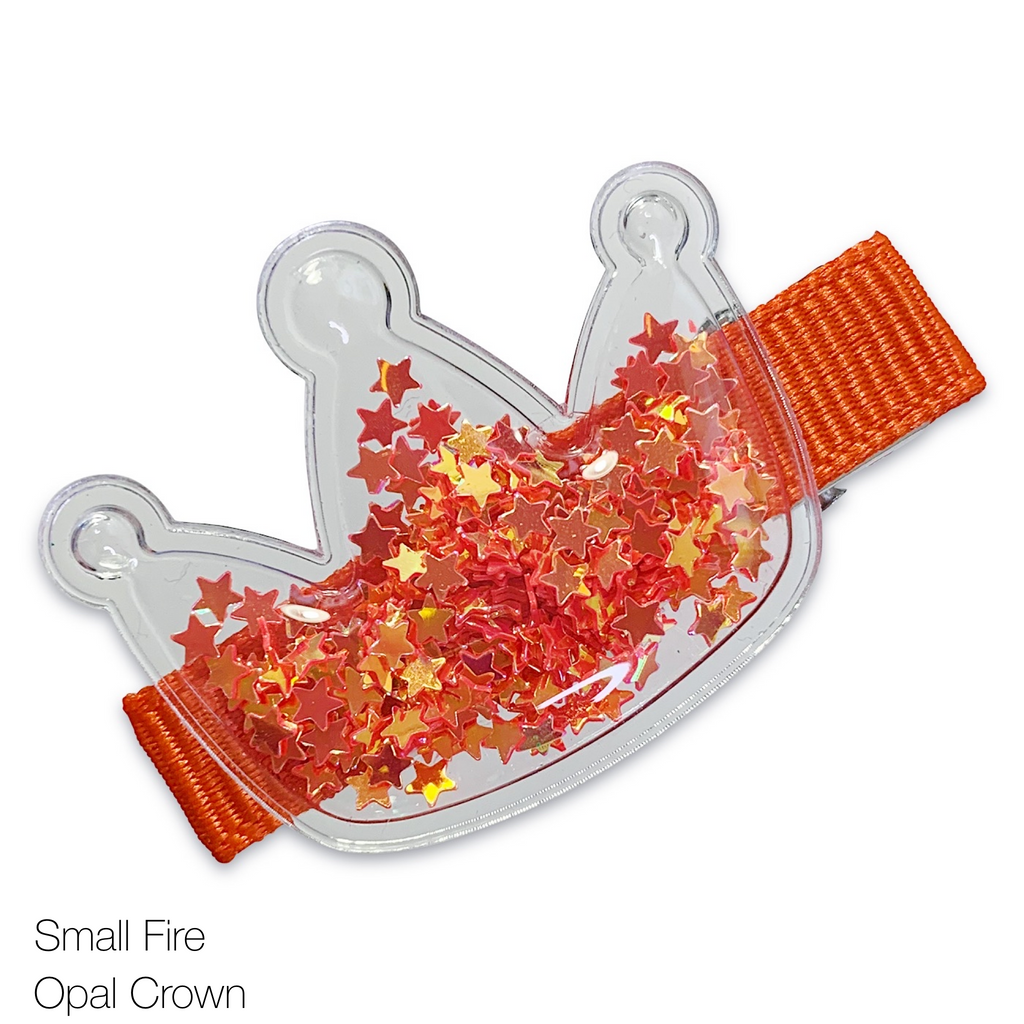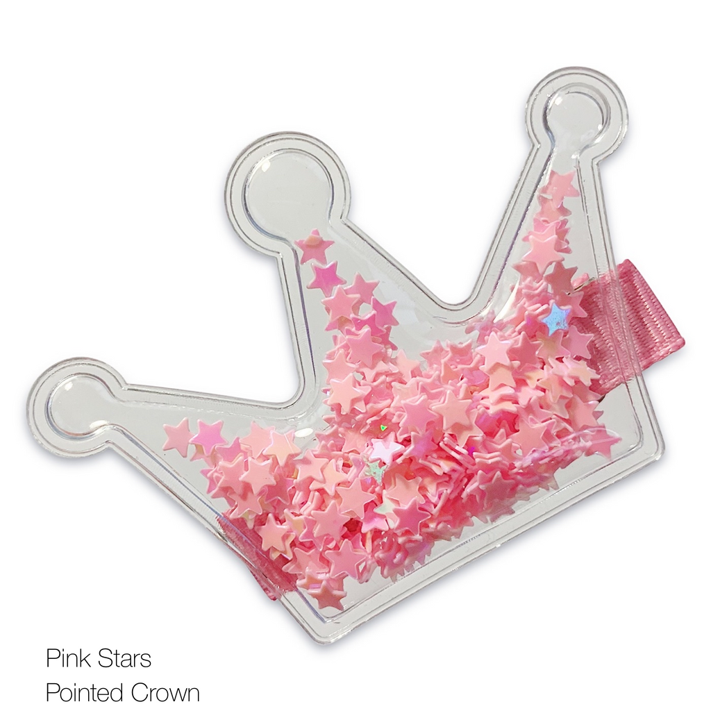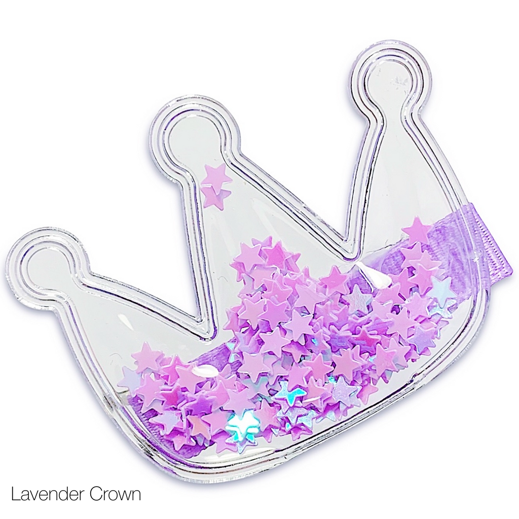 Each crown shaker (a puffed vinyl "pouch" filled up with an assortment of confetti fun that moves when you move) is attached to our no slip alligator clip and measures approximately 2 inches. There is a smaller crown in a few color options which measures 1.5 inches.