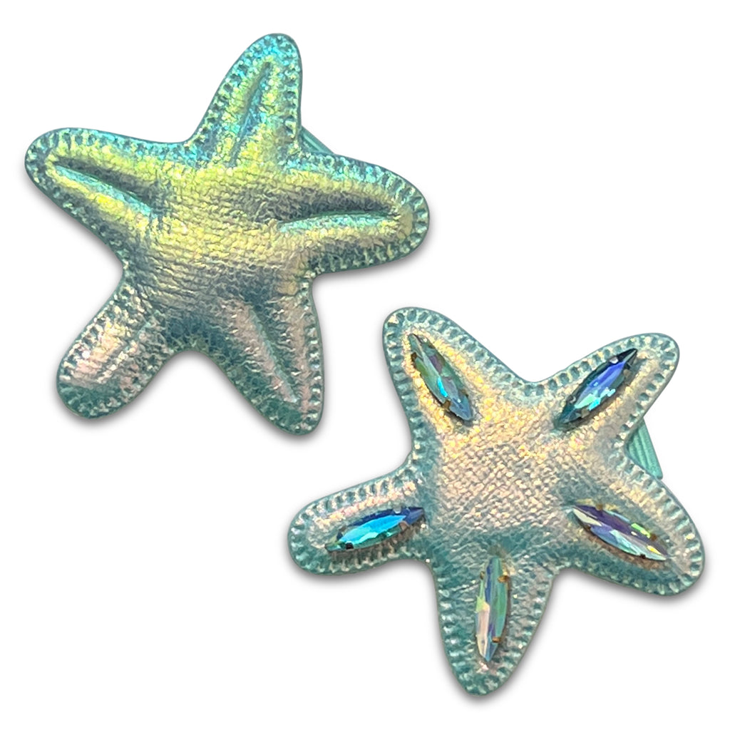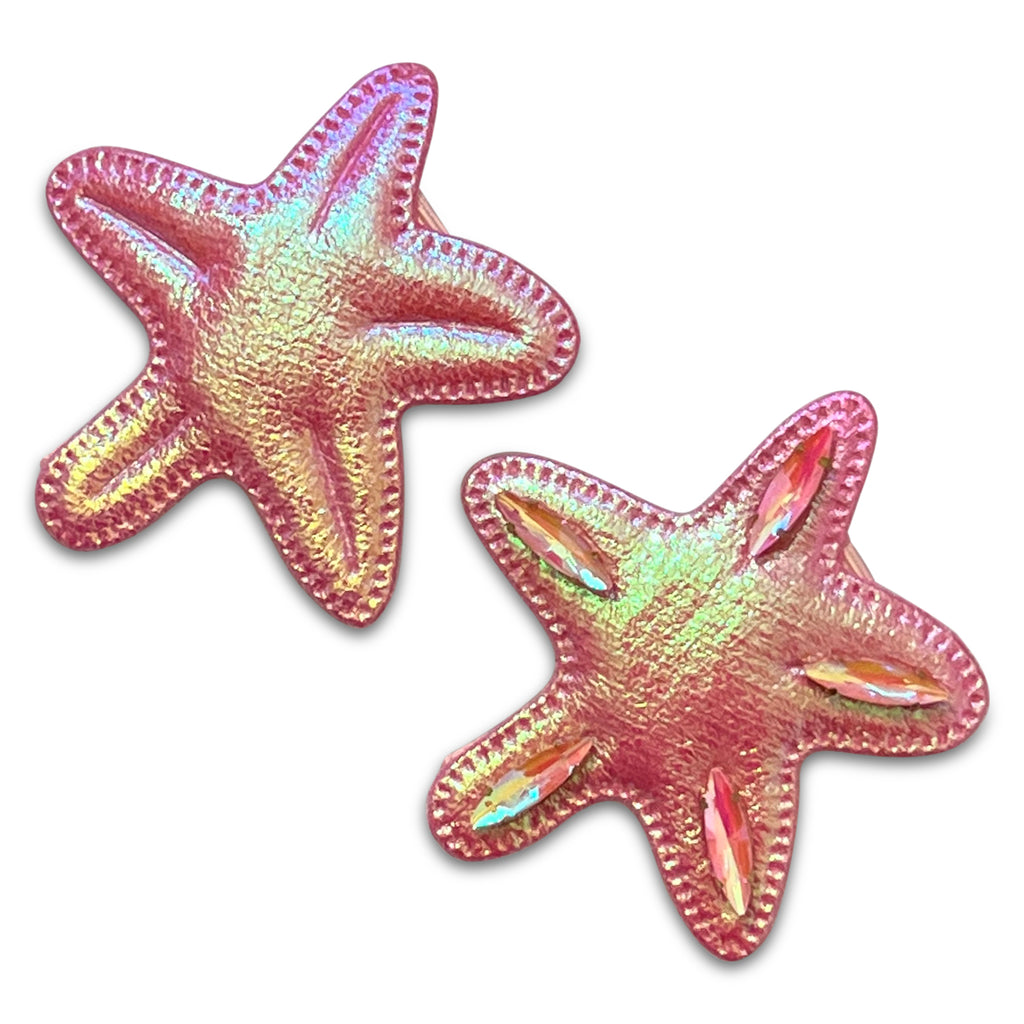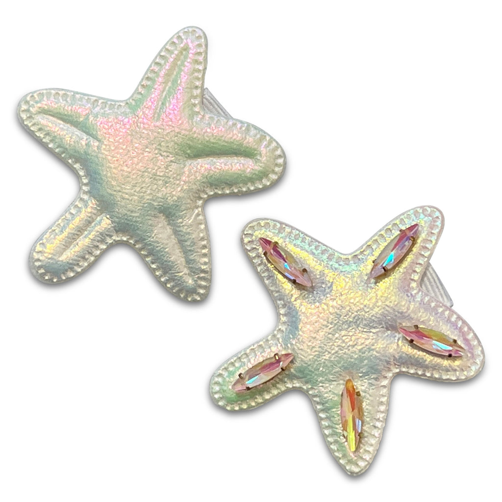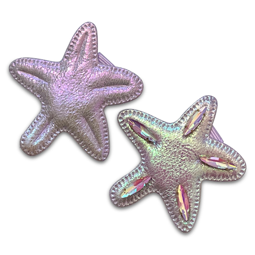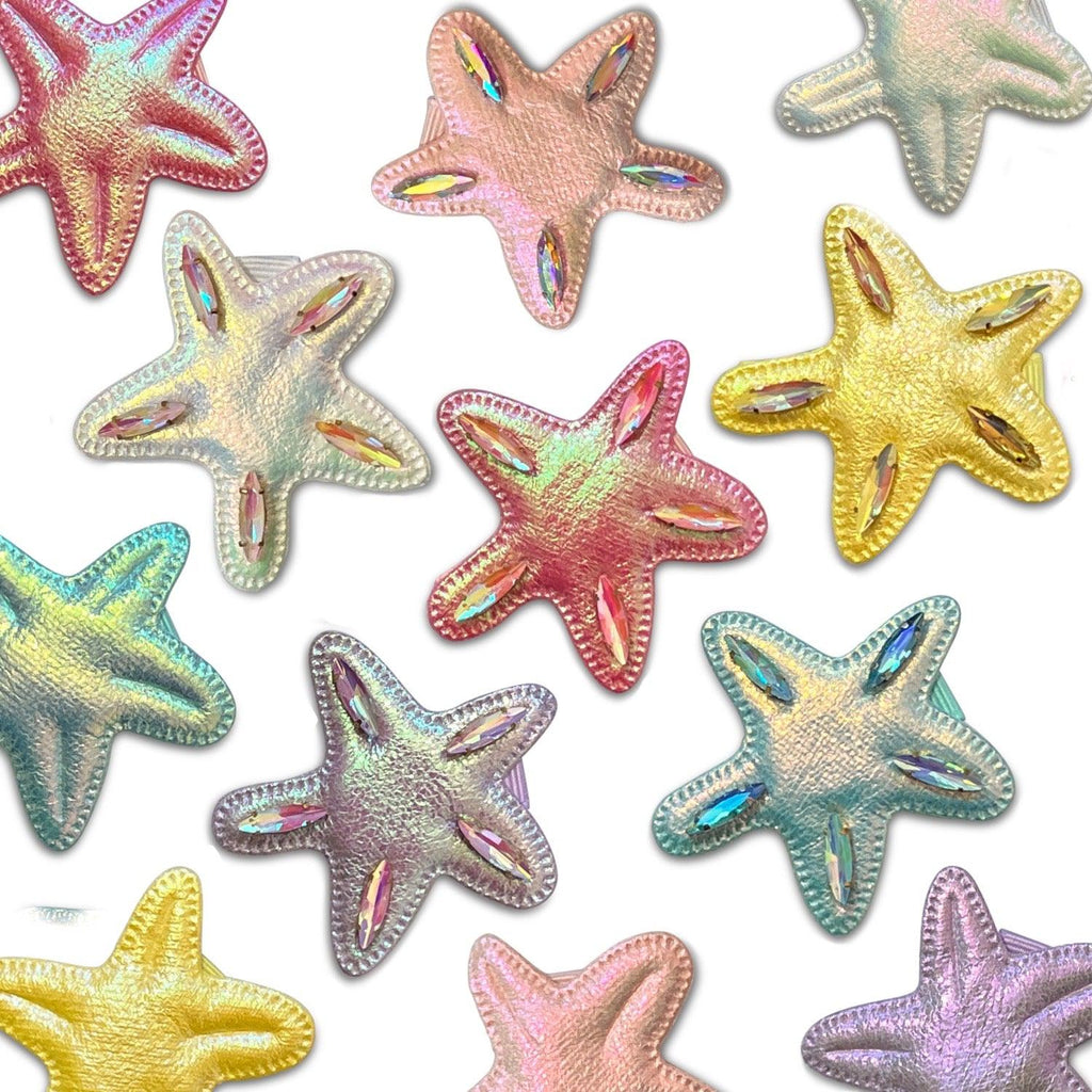 Each starfish is 2+ inches and is attached to our no slip lined alligator clip with coordinating no slip grip.  There is a beautiful coordinating glass gem on each of the five crevices of the starfish. You can leave a note when checking out if you would prefer that your starfish doesn't have glass gems.