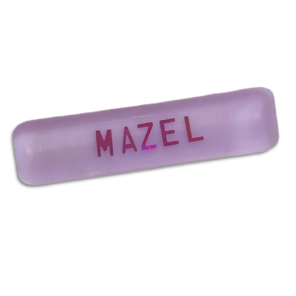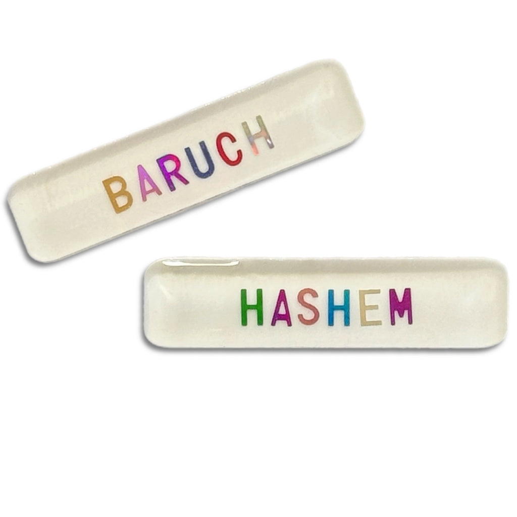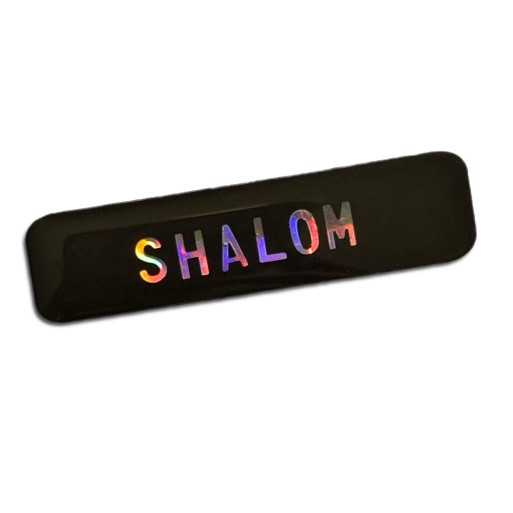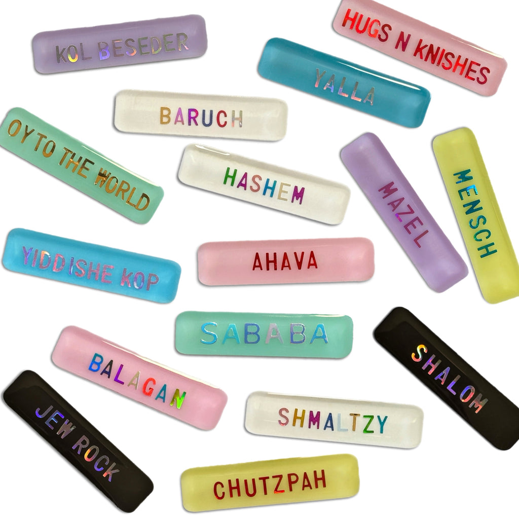 Add a pop of personality to your look with our Shmooze Hair Clips- bold, playful, and full of Jewish flair. These vibrant pieces are sprinkled with holographic letters that spell out beloved Hebrew, Yiddish and Jewish themed words you know and love. Each clip is a fun nod to Jewish identity and humor- perfect for gifting or sparking some shmoozing at your next simcha (celebration), chag (holiday), Shabbat or any outing. Let your style shmooze a little louder and grab a clip/magnet/pin (or three) and wear your heritage with pride and playfulness.