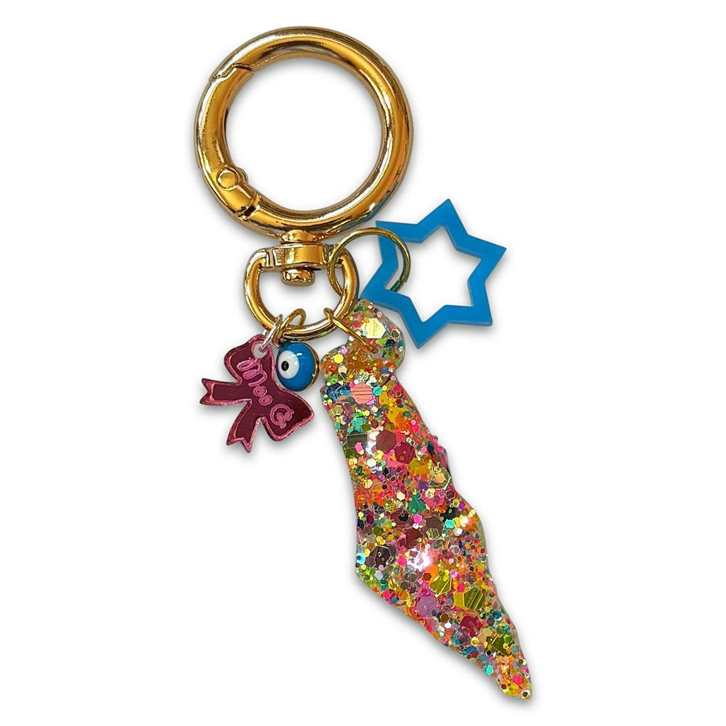 These map of Israel resin bag charms are made with different sparkling glitters and each has a Star of David (acrylic or metal) as well as a very small blue eye attached to it.